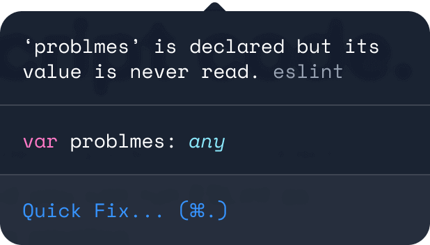Learn more about finding issues with ESLintMany problems ESLint finds can be automatically fixed. ESLint fixes are syntax-aware so you won't experience errors introduced by traditional find-and-replace algorithms.